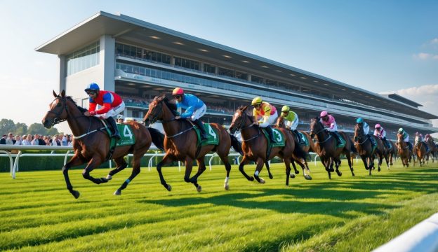 Beberapa joki menunggang kuda pacu di lintasan dengan tribun penonton dan langit cerah di latar belakang.