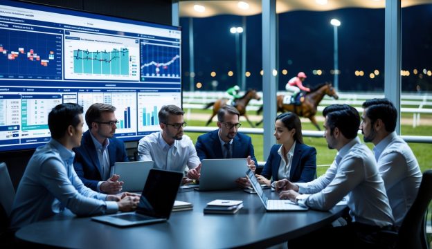 Sekelompok analis yang fokus berdiskusi di ruang malam hari dengan layar besar menampilkan data kuda dan performa balap, dengan lintasan balap kuda terlihat di latar belakang.